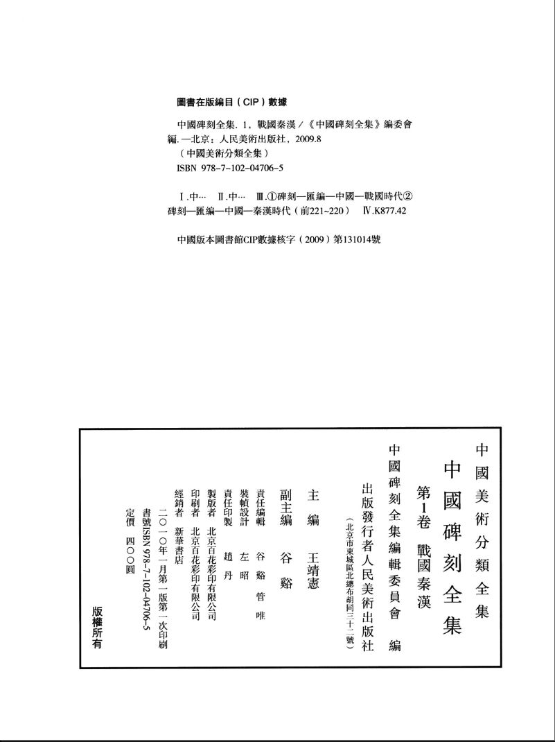 第一卷:战国石鼓文 秦泰山刻石 汉开通褒斜道刻石 汉祀三公山碑 汉裴岑纪功碑 汉武梁祠堂画像题字 汉石门颂 汉乙瑛碑 汉礼器碑。