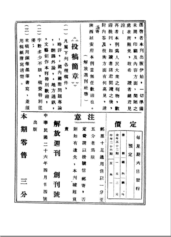 1937年4月24日,中共中央机关刊物――《解放》周刊在延安蓝家坪创刊。《解放》周刊辟有时评、翻译、通讯、文艺等专栏,中共中央领导人毛泽东、张闻天、朱德、周恩来、博古等都在该刊上发表文章。 《解放》创刊之初,面临着中国共产党为建立抗日民族统一战线而奋斗的任务。为此,它刊发了毛泽东的《中国抗日民族统一战线在目前阶段的任务》和《为争取千百万群众进入抗日民族统一战线而斗争》等文章,全面分析了当前形势,提出了中国共产党在抗日民族统一战线中的任务。1937年7月8日,“七七事变”爆发的第二天,《解放》第10期刊登了《中国共产党为日军进攻卢沟桥通电》,呼吁“只有全民族实行抗战,才是我们的出路”。1937年8月,《解放》第15期全文刊登了《中共中央关于目前形势与党的任务的决定》、《为动员一切力量争取抗战胜利而斗争》、《中国共产党抗日救国十大纲领》这三个文件,动员全国一切力量争取抗战胜利。抗日战争进入相持阶段后,《解放》刊发了邓小平的《艰苦奋斗中的冀南》、左权的《论坚持华北抗战》等文章,从不同侧面反映了八路军、新四军以及抗日游击队的发展壮大。 《解放》是在中共中央和毛泽东等中央领导的亲自指导和支持下创办的。对于每个时期的宣传要点,毛泽东都亲自过问,重要的社论、评论和文章都亲自审阅。从第17期起,毛泽东为《解放》题写了刊名。为纪念抗日战争一周年,毛泽东为《解放》写了封面题词:“坚持抗战,坚持统一战线,坚持持久战,最后胜利必然是中国的。” 1941年8月31日,为了集中力量办好中央机关报《解放日报》,《解放》周刊停办。作为抗日战争时期中国共产党公开出版的政治理论刊物,《解放》周刊先后出版了134期,为抗日战争的胜利做出了不可磨灭的贡献。