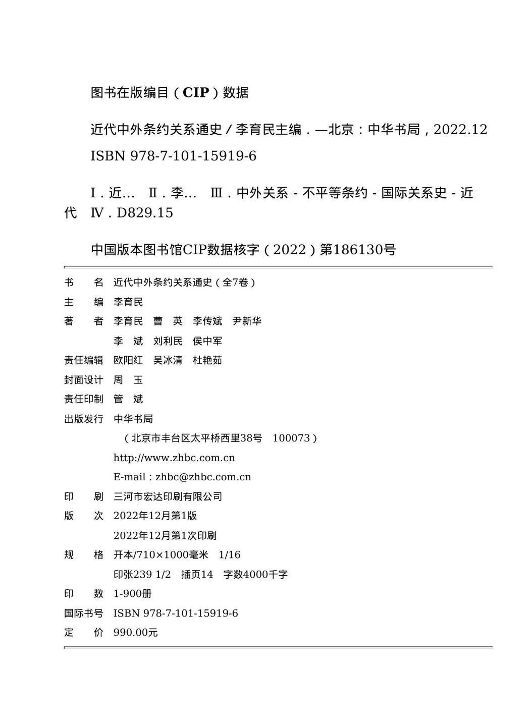 《近代中外条约关系通史》是由李育民主编的七卷本学术著作,2022年由中华书局出版。全书以1689年至1949年间中外条约关系的演变为研究对象,分六个历史阶段梳理从宗藩体制到条约关系、从不平等到趋向平等的转变历程。通过分析《南京条约》《辛丑条约》等关键条约,系统性揭示不平等条约体系对中国的侵害,以及中华民族反抗压迫、争取主权独立的百年抗争史。该书突破传统研究框架,深度探讨治外法权、关税自主权等议题,建构中国学术话语体系,入选2023年度中华书局古籍学术类十佳图书。