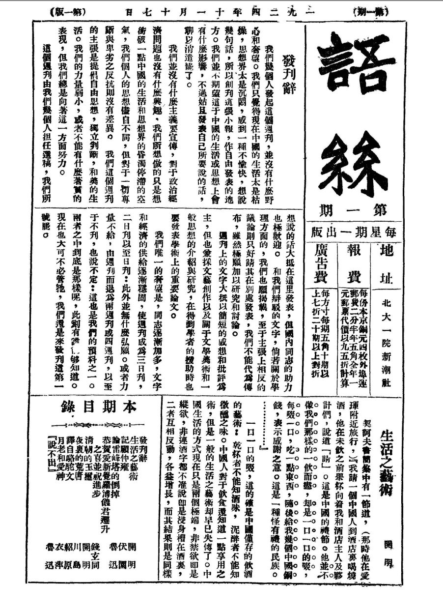 《语丝》是中国现代文艺刊物,创刊于1924年11月17日,由鲁迅等人发起,北京大学新潮社编辑,北新书局发行,为周刊,共出版260期。 [1]该刊是1924年11月《晨报副刊》编辑孙伏园因抽稿事件辞职后,联合周作人、鲁迅等16位撰稿人集资创办,作为《新青年》分裂后的文化延续。 [2] [8]首期采用16开三栏排版,由北大印刷所承印,初创期依托同人集资维持运营。 [8]