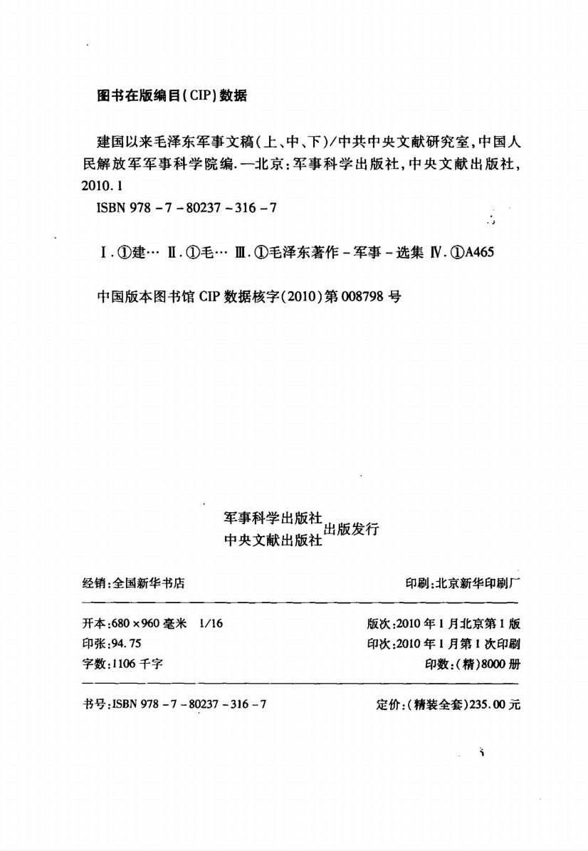 建国以来毛泽东军事文稿(上中下卷)收入的文稿,分别根据《毛泽东文集》、《毛泽东军事文集》等文献集,中央档案馆保存的手稿、原抄件、讲话或谈话记录稿,当时的有关报刊刊印。对部分文稿作了节选。对多数文稿重新拟了标题。对已公开发表的权威版本和毛泽东手稿,均保持版本的原貌,仅对其中的错字、漏字、衍字和不规范用字作了订正,并校订了标点符号,改正了明显错讹的史实。毛泽东是伟大的马克思主义者,无产阶级革命家、战略家和理论家。新中国成立后,毛泽东精心指导国防和军队现代化建设,领导进行抗美援朝战争和多次边境自卫防御作战,同国内外敌对势力分裂祖国和搞“两个中国”或“一中一台”的图谋进行坚决的斗争,捍卫了国家主权、安全和领土完整,为社会主义革命和建设创造了有利的和平环境。毛泽东领导人民军队坚持全心全意为人民服务的宗旨,发扬艰苦奋斗、拥政爱民的优良传统,在支援国家建设等方面发挥了重要作用。这一时期毛泽东的军事理论和实践活动,进一步丰富和发展了毛泽东军事思想。为比较完整地反映毛泽东作为伟大的无产阶级军事家所做的历史性贡献,我们编辑了《建国以来毛泽东军事文稿》。《建国以来毛泽东军事文稿(上中下卷)》编为上、中、下三卷,收入毛泽东有关军事理论、军事战略、国防和军队现代化建设、反侵略战争准备以及抗美援朝战争、对台斗争、援越抗法、援越抗美、边境自卫防御作战等方面的电报、批示、讲话、谈话、书信、题词等八百二十一篇,其中九十一篇为首次公开发表。